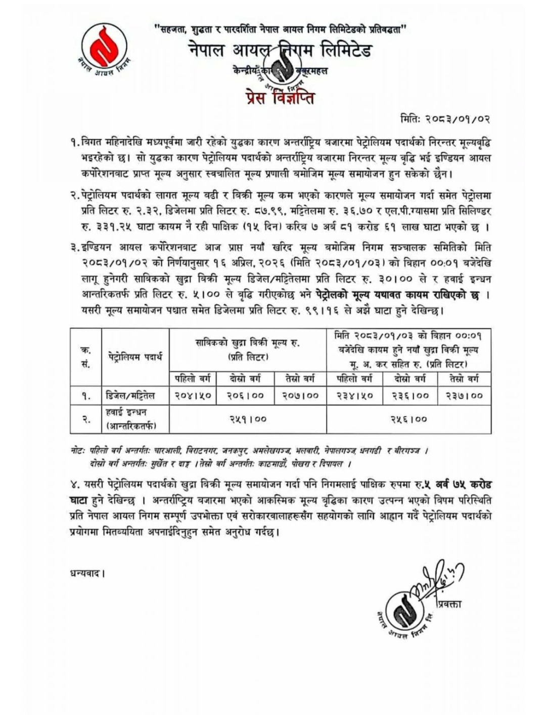 मूल्य बढेसँगै अब डिजेल र मट्टितेल प्रतिलिटर पहिलो वर्गका लागि २३४.५०, दोस्रोका लागि २३६ र तेस्रो वर्गका लागि २३७ पुगेको छ। मूल्य समायोजन भए पनि अझै डिजेलमा ९९.१६ रूपैयाँ घाटा रहेको निगमले जनाएको छ।