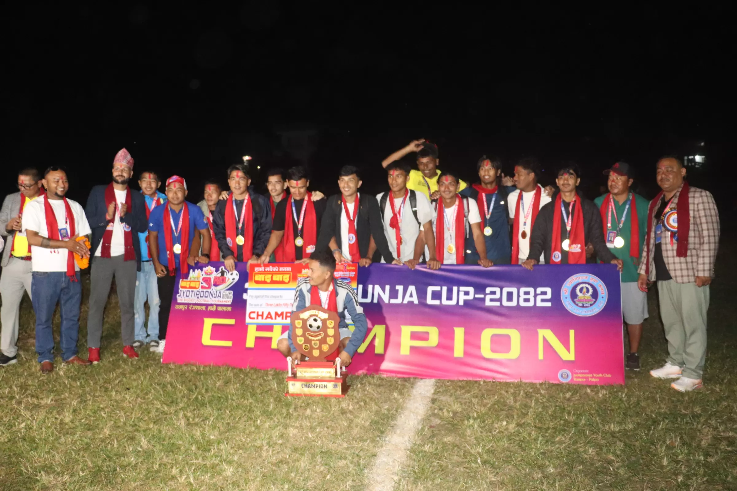 रामपुर,९ कार्तिक । रामपुरमा सम्पन्न वाइवाइ तेस्रो ज्योतिपुञ्ज कपको उपाधि आयोजक ज्योतिपुञ्ज युवा क्लव रामपुर उपाधि जित्न सफल भएको छ । सोमबार भएको फाइनल खेलमा दोस्रो संस्करणको विजेता टिम युनाईटेड युथ क्लव गिरुबारी, नवलपुरलाई १-० गोल अन्तरले पराजित गर्दै ज्योतिपुञ्जले तेस्रो संस्करणको उपाधि प्राप्त गरेको हो ।जिल्ला कै सर्वाधिक पुरस्कार राशी सहित रामपुरमा भएको प्रतियोगिताको फाइनल खेलमा ज्योतिपुञ्जले सुमित श्रेष्ठको एक गोलको योगदानमा उपाधि जित्न सफल भएको हो । खेलको पहिलो हाफ गोल रहित बराबरीमा सकिएको थियो । दोस्रो हाफमा खेलको ७३ औं मिनेटमा श्रेष्ठले ज्योतिपुञ्जको लागि गोल गर्दै १-० को अग्रता दिलाउन सफल भएको हाे । अन्तत श्रेष्ठले गरेको गोल नै उपाधिको निर्णायक बन्न पुगेको हो । खेलमा पराजित भए संगै उपाधिको दाबेदार युनाईटेड युथले रामपुर–७, किसानबारी ज्योतिपुञ्ज खेल मैदानमा भएको प्रतियोगिताको उपविजेतामा चित्त बुझाएको छ । प्रतियोगिताको उपाधि विजेता आयोजक ज्योतिपुञ्जले नगद ३ लाख ५० हजार र उपविजेता युनाईटेड युथ क्लवले नगद २ लाख सहित ट्रफी, मेडल र प्रमाणपत्र पाएको छ । सेमिफाइनलमा पराजित टिम अभिषेक चर्च रजहर र देवदह ब्वाईजलाई आयोजकले २५–२५ हजार रुपियाँ प्रदान गरेको छ । प्रतियोगितामा सर्वोत्कृष्ट खेलाडी ज्योतिपुञ्ज युवा क्लवका आशिष गुरुङ हुनु भएको छ । खेल संयोजक अनिल शाहीका अनुसार उत्कृष्ट गोलकिपर ज्योतिपुञ्ज युवा क्लवका सरोज तामाङ, उत्कृष्ट डिफेन्डर युनाईटेड युथ क्लव गिरुबारीका सुमित मल्लाह, हाईस्कोरर देवदह ब्वाईजका आशिष जिसी, इमर्जिङ प्लेयर युनाईटेड युथ क्लव गिरुबारीका याम प्रसाद बुढा र उत्कृष्ट कोच ज्योतिपुञ्ज युवा क्लवका केशवराज श्रेष्ठ हुनुभएको छ ।