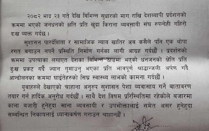 बुटवल, २७भदौ । खुद्रा किराना व्यवसायी संघ रुपन्देहिले बर्तमान परिवेशमा कालोबजारी हुने संभावन रहेको भन्दै सचेत हुन सबैमा अग्रह गरेको छ । खुद्रा किराना संघका अध्यक्ष महेन्द्र प्रसाद पोखरेलद्वारा जारी विप्रेस विज्ञप्ती मा...