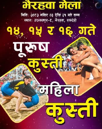 भैरहवा, १३ मंसिर । रुपन्देहीको भैरहवामा सञ्चालित सातौं लुम्बिनी महोत्सव–२०८२ (उद्योग, व्यापार, कृषि तथा पर्यटन प्रवद्र्धन) अन्तर्गत मंसिर १४ गतेदेखि कुस्ती प्रतियोगिता हुने भएको छ । मंसिर १४ देखि १६ गतेसम्म (तीन दिन) कुस्ती प्रतियोगिता...