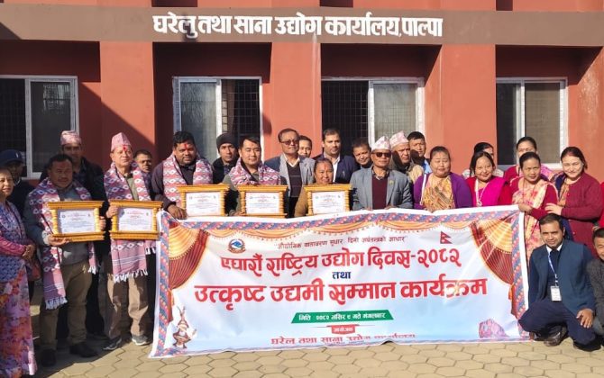 पाल्पा, ९ मंसिर । घरेलु तथा साना उद्योग कार्यालय पाल्पाले जिल्लाका ५ जना उद्यमीहरूलाई उत्कृष्ट उद्यमी सम्मान तथा पुरस्कृत सम्मान गरेको छ । एघारौ राष्ट्रिय उद्योग दिवस २०८२ को अवसरमा उनिहरूलाई सम्मान गरिएको हो...