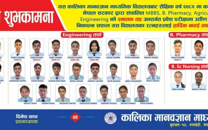 बुटवल,१४ मंसिर । बुटवल १० कालिका नगरमा रहेको कालिकामानवज्ञान मावि बाट कक्षा १२ उत्र्तीण गरेका ४२ जना विद्यार्थीले नेपाल सरकारले प्रदान गर्ने स्नातक तर्फ विभिन्न संकायका निःशुल्क छात्रवृत्तीमा नाम निकाल्न सफल भएका...