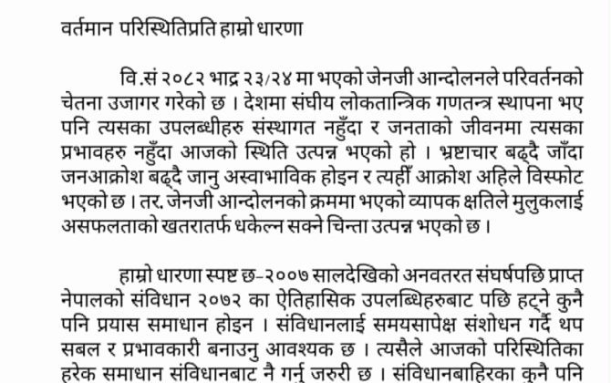 बुटवल, २७भदौ । प्रगतिशील लेखक संघ, नेपाल रूपन्देहीले भदौ २३/२४ मा भएको जेनेजि आन्दोलनले मुलुकमा परिवर्तनको चेतना उजागर गरेको बताउँदै त्यसलाई संस्थागत गर्न आवश्यक रहेको धारणा सार्वजनिक गरेको छ । संघले आज एक विज्ञप्ति जारी...
