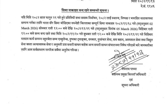 काठमाडौँ,१७ फागुन । नेपाल राष्ट्र बैंकले बैंक तथा वित्तीय संस्थाहरूलाई आवश्यक सेवा निरन्तर उपलब्ध गराउन निर्देशन दिएको छ। निर्वाचन आयोगको अनुरोध अनुसार केन्द्रीय बैंकले सार्वजनिक बिदाका दिनसमेत वित्तीय कारोबार सञ्चालन गर्ने व्यवस्था मिलाउन सम्बन्धित संस्थाहरूलाई...