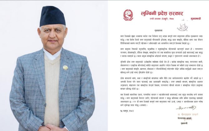 दाङ,१५ फागुन । मगर दिवसको अवसरमा लुम्बिनी प्रदेशका मुख्यमन्त्री चेतनारायण आचार्यले स्वदेश तथा विदेशमा रहेका सम्पूर्ण मगर समुदायप्रति शुभकामना व्यक्त गर्नुभएको छ । शुभकामना सन्देश जारी गर्दै मुख्यमन्त्री आचार्यले मगर समुदायको गौरवशाली इतिहास, समृद्ध कला...