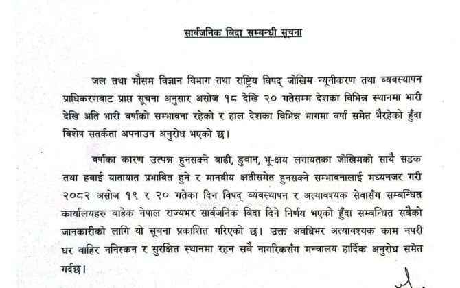 काठमाडौ ,१८ असोज । सरकारले भोलि (आइतबार) र पर्सि (सोमबार) सार्वजनिक बिदा दिएको छ । देशभर आएको अविरल वर्षासँगैको प्रतिकूल अवस्थालाई मध्यनजर गर्दै थप दुई बिदा दिने निर्णय भएको गृह मन्त्रालय स्रोतले जानकारी दिएको छ...
