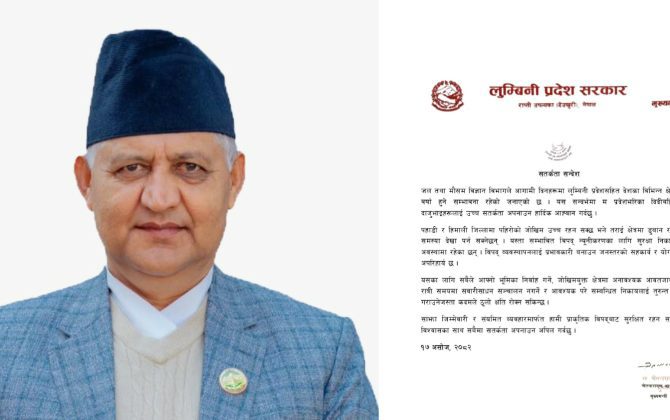 दाङ,१७ असोज । लुम्बिनी प्रदेशका मुख्यमन्त्री चेतनारायण आचार्यले संभावित भारी वर्षा तथा त्यसबाट उत्पन्न हुन सक्ने विपद् जोखिमप्रति सतर्क रहन प्रदेशवासीलाई आह्वान गर्नुभएको छ । जल तथा मौसम विज्ञान विभागले लुम्बिनी प्रदेशसहित देशका विभिन्न स्थानमा...
