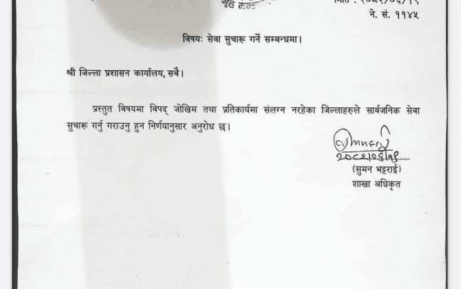 बुटवल,१९ असोज । गृह मन्त्रालयले विपद्को जोखिम नरहेका तथा प्रतिकार्यमा संलग्न नरहेका जिल्लाहरूमा सार्वजनिक सेवा सुचारु गर्न गराउन निर्देशन दिएको छ ।देशभरका जिल्ला प्रशासन कार्यालयहरूलाई पत्राचार गर्दै मन्त्रालयले उक्त निर्देशन दिएको हो । सरकारले यसअघि...