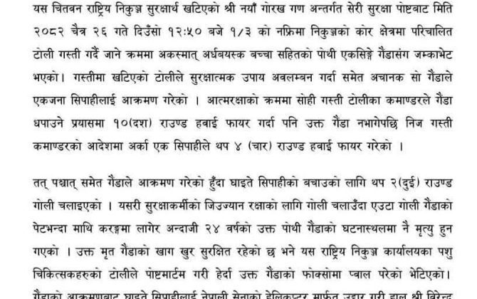 भरतपुर ,२७ चैत । चितवन राष्ट्रिय निकुञ्ज क्षेत्रमा गस्तीका क्रममा आक्रमण भएपछि आत्मरक्षाका लागि चलाइएको गोली लागेर एक पोथी एकसिङ्गे गैंडाको मृत्यु भएको छ। निकुञ्ज सुरक्षार्थ खटिएको नेपाली सेना अन्तर्गत श्री नयाँ गोरख गणको सेरी...