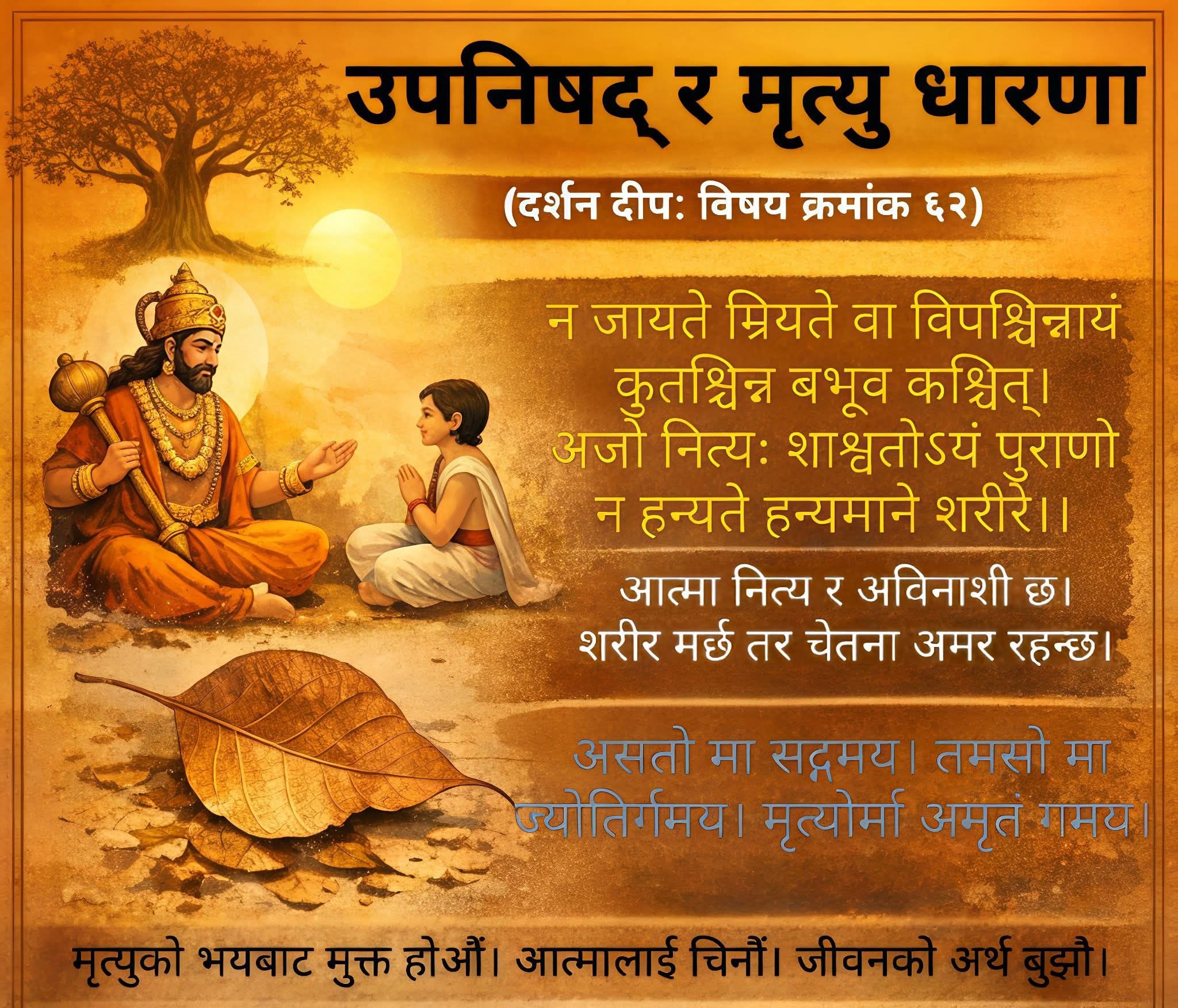 (दर्शन दीप: विषय क्रमांक ६२) हाम्रो समाजमा एउटा पुरानो उखान छ, ‘जन्मिएपछि एकदिन मर्नैपर्छ।’ यो सुन्दा जति सामान्य लाग्छ, यसको गहिराइ भने त्यति नै अथाह छ। हिजाे दिउँसो कार्यालय परिसरमा रहेकाे पिपलको सुकेको पात...